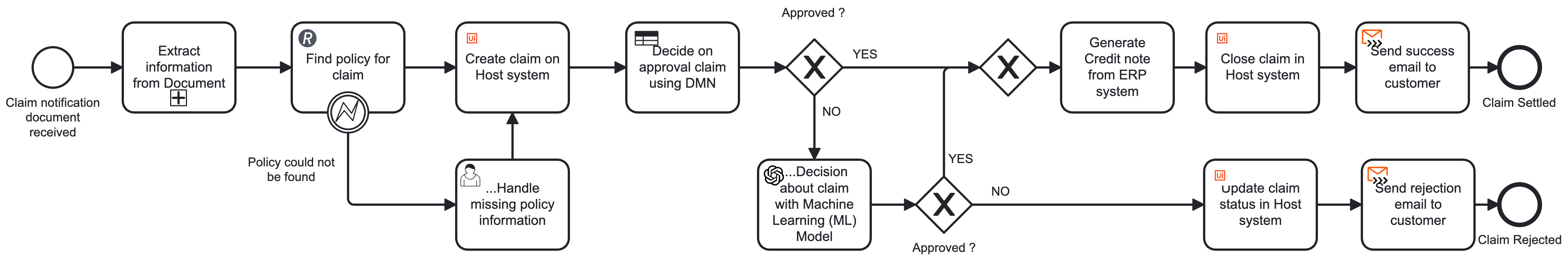 Below the end-to-end process orchestration of a claim process that makes use of one orchestration platform and at the same time seamlessly integrates with existing Machine Learning (ML) Models, RPA, ERP and other legacy systems touched in the process: