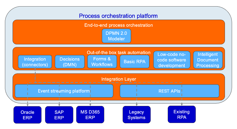 Below an overview of a Process Orchestration Platform where the integration layer is seen as part of the platform and in this example, the integration with ERP systems is via an event streaming platform such as Apache Kafka.